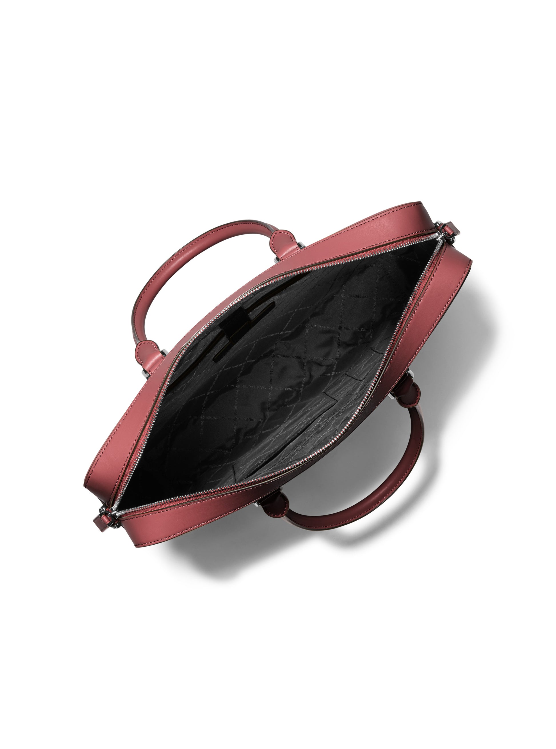 Interior details: 2 front zip and slip pockets, laptop compartment