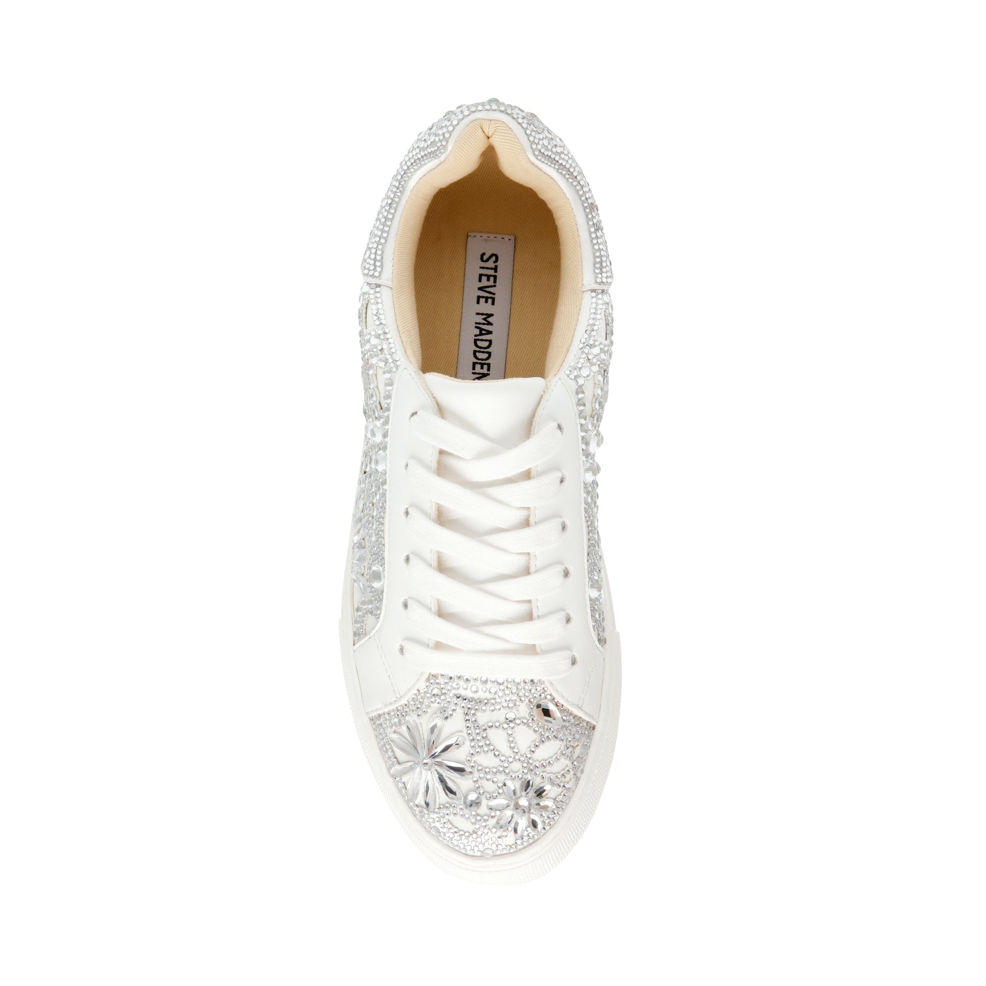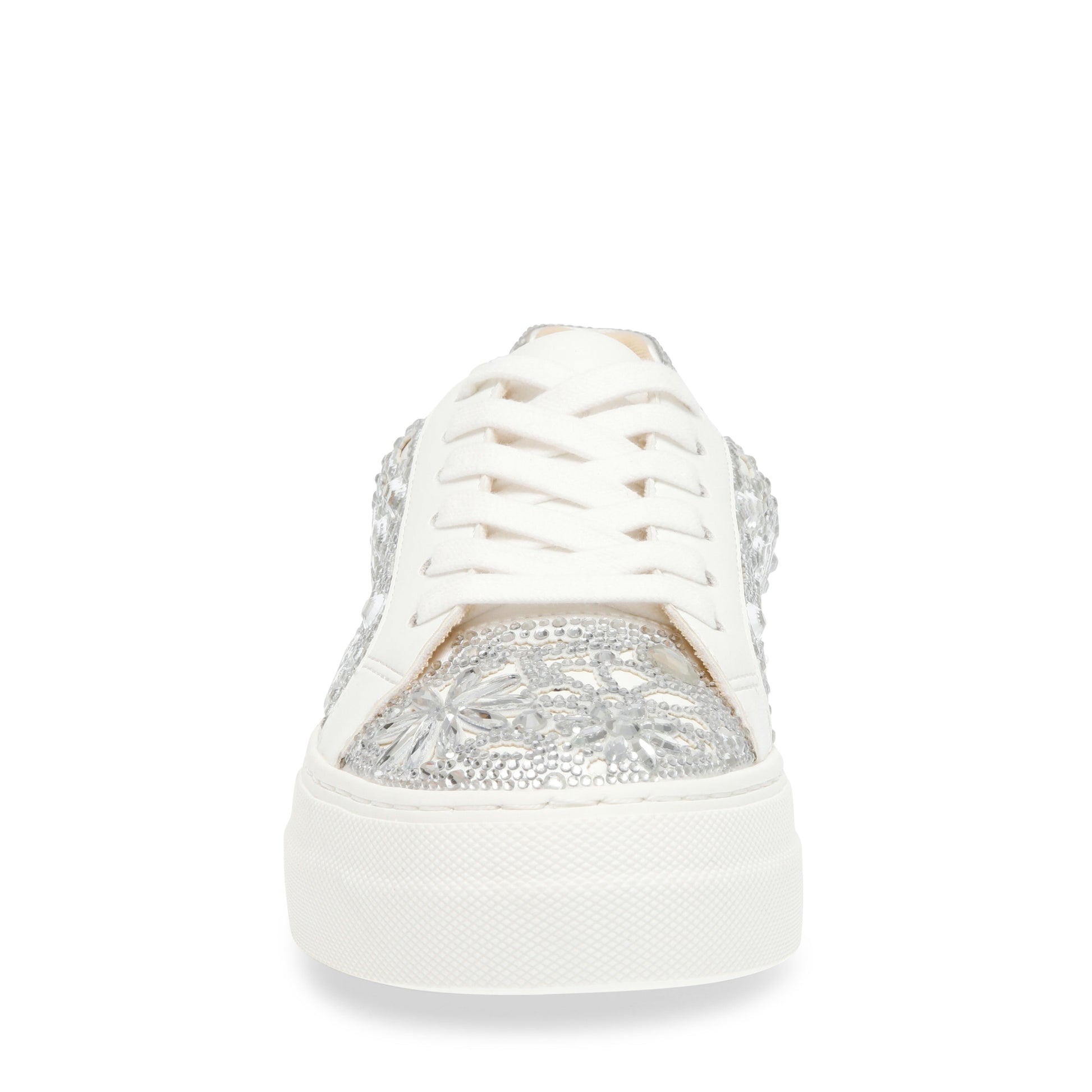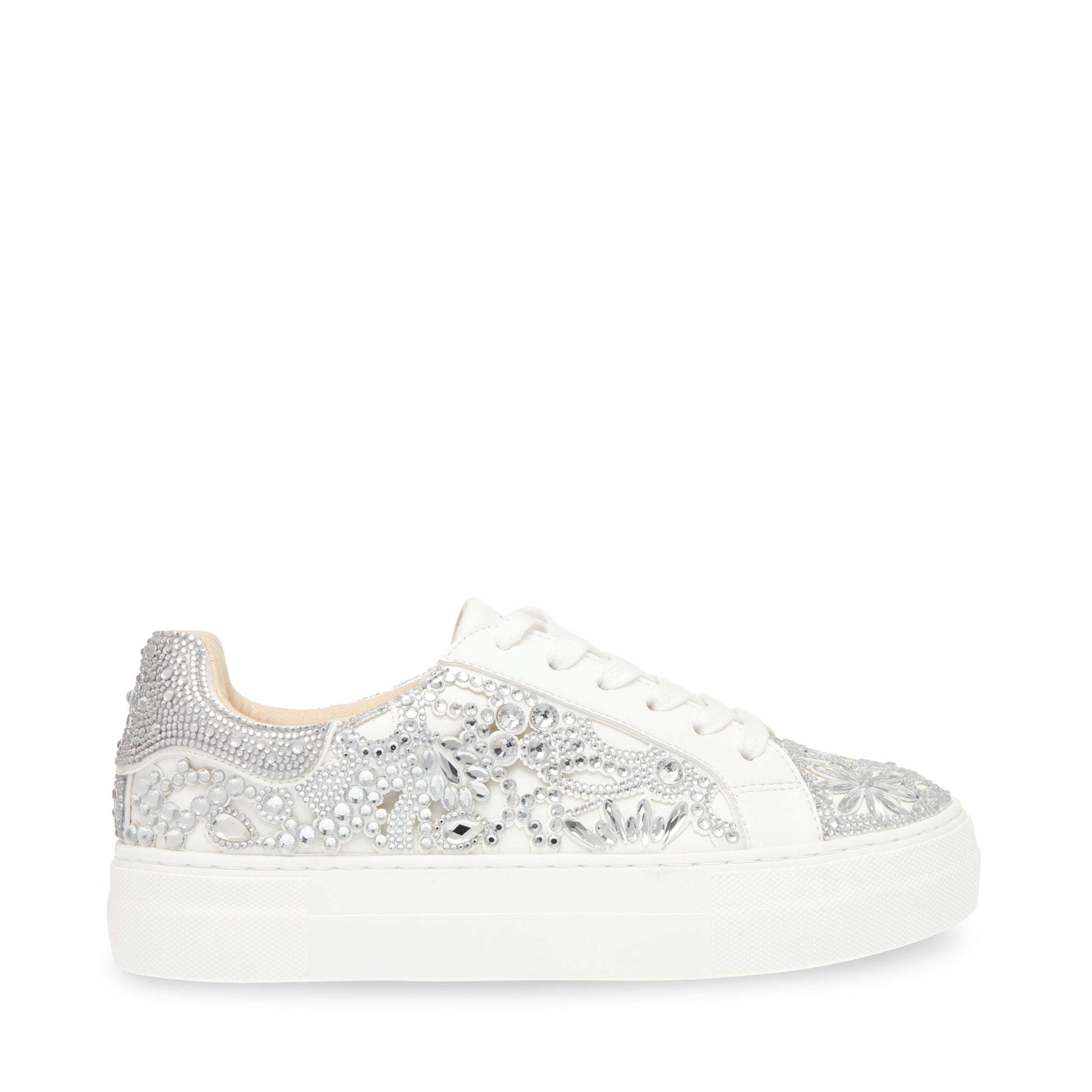 REMMIE is a classic white sneaker all glammed up. This glitzy kick is covered in multi-sized rhinestones for some intricate, high-shine accents and texture. She's complete with a chunky flatform sole, allowing for an elevated silhouette you'll feel and look great in.