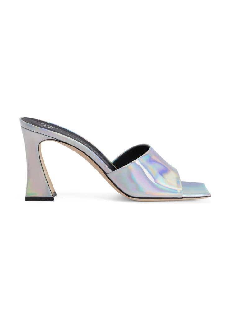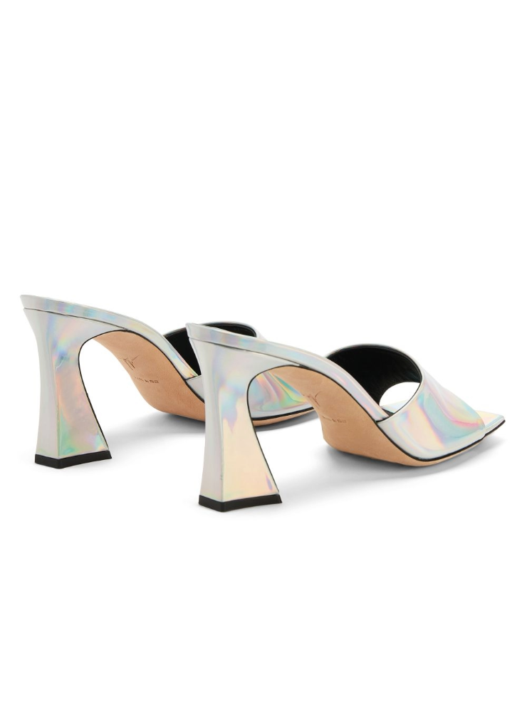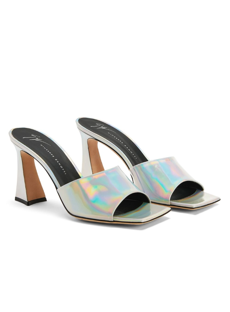 These mules, crafted from mirror-effect iridescent silver synthetic fabric, feature a matching covered spool heel and are characterized by a square toe and a leather sole with logo.