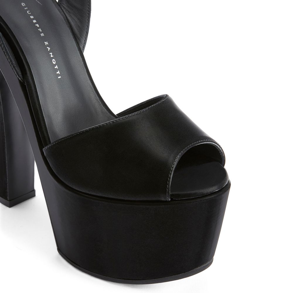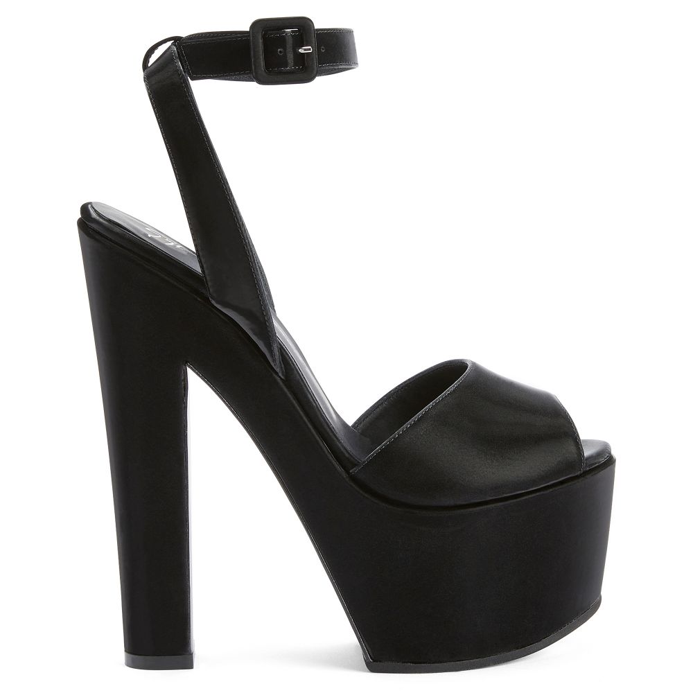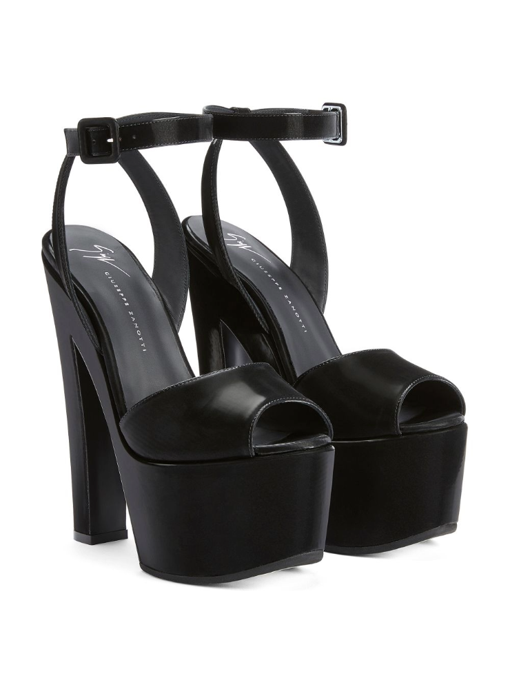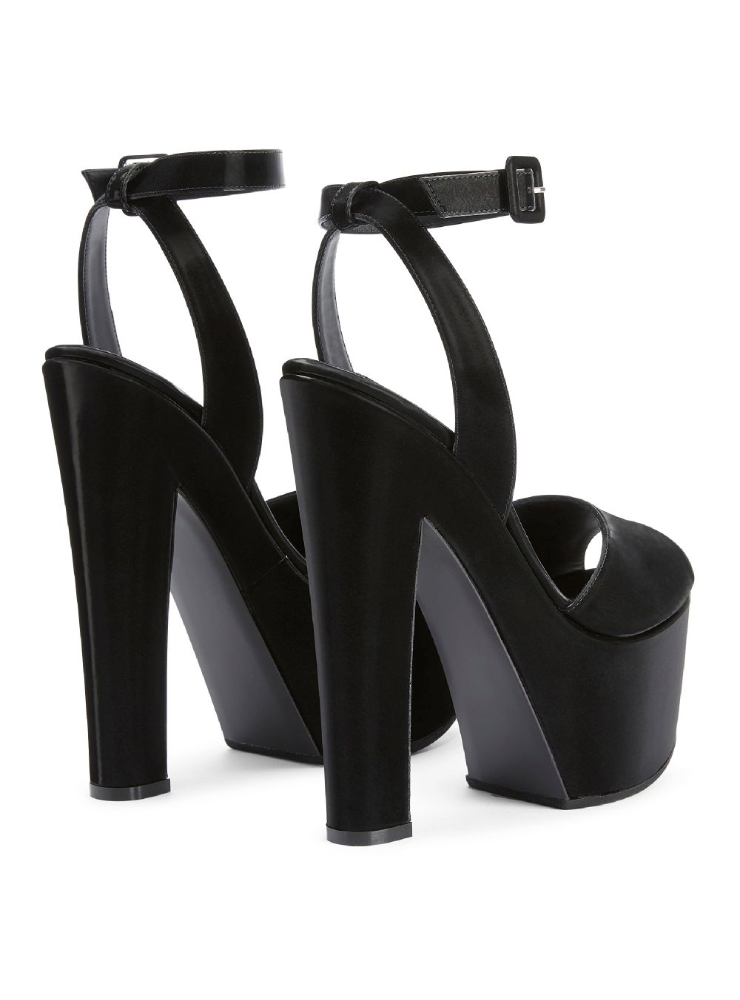 Peep-toe sandals crafted from black laminated synthetic fabric featuring an adjustable ankle strap with a coordinated buckle and matching high chunky heels and platforms.